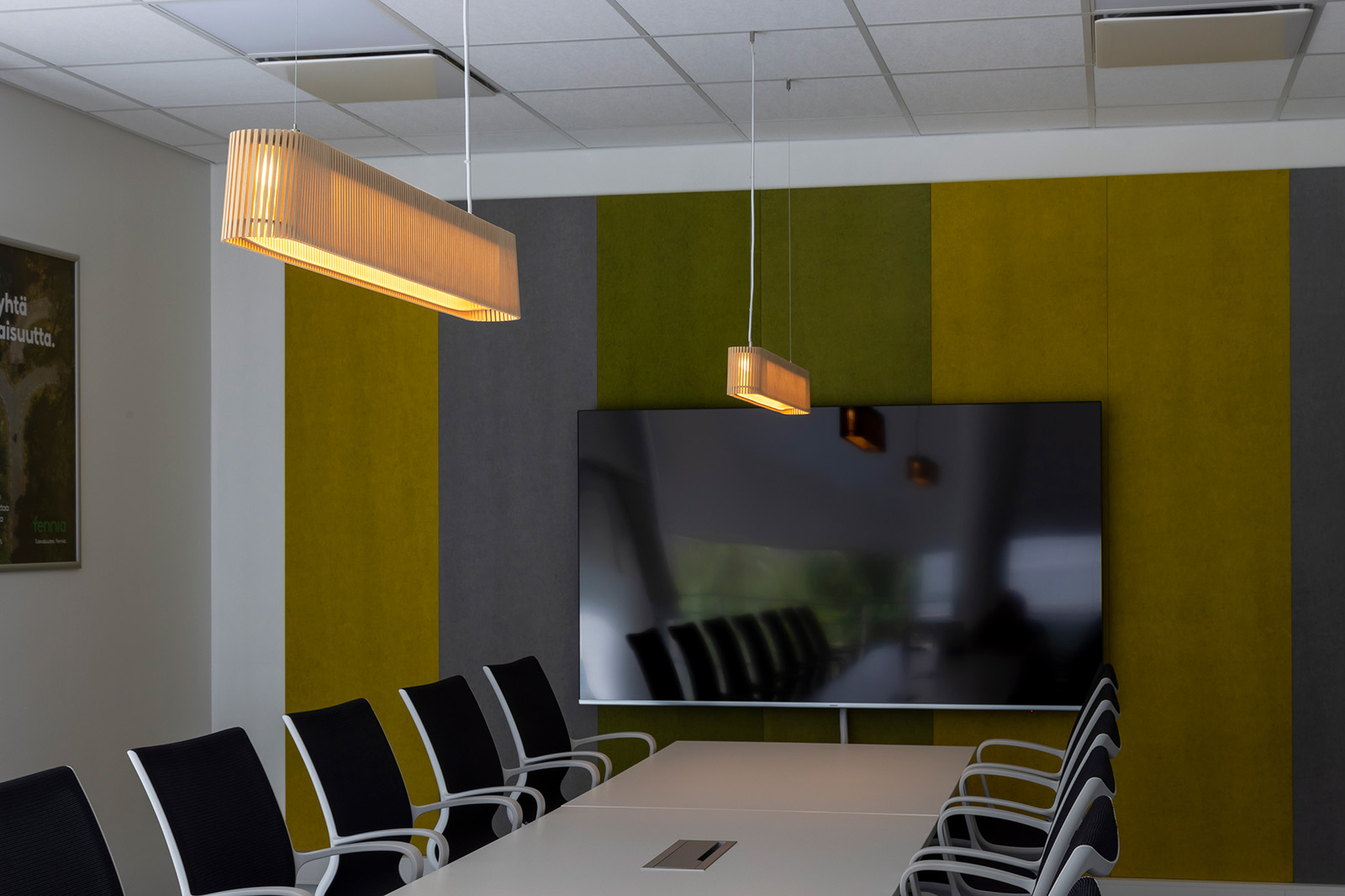 Die einen Meter langen Owalo-Pendelleuchten eignen sich perfekt für Besprechungsräume und bringen die ansprechende Wärme des Holzes ins Innere. Image: Fennia. Turku, Finland. Photo by Uzi Varon.