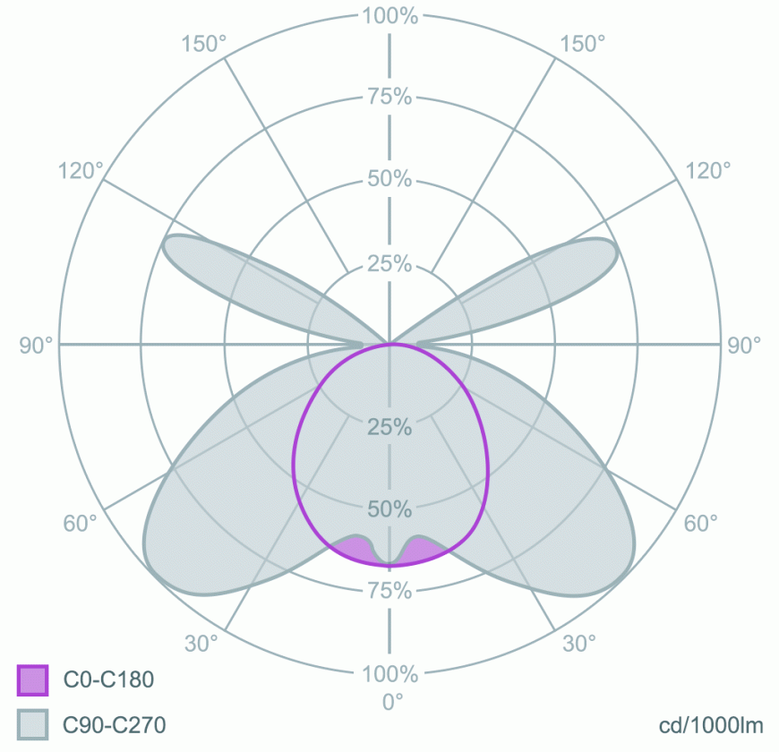 Courbe de distribution de la lumière de la lampe Teelo 8020. Comme le luminaire est symétrique, la courbe de distribution de la lumière est similaire à chaque plan C.